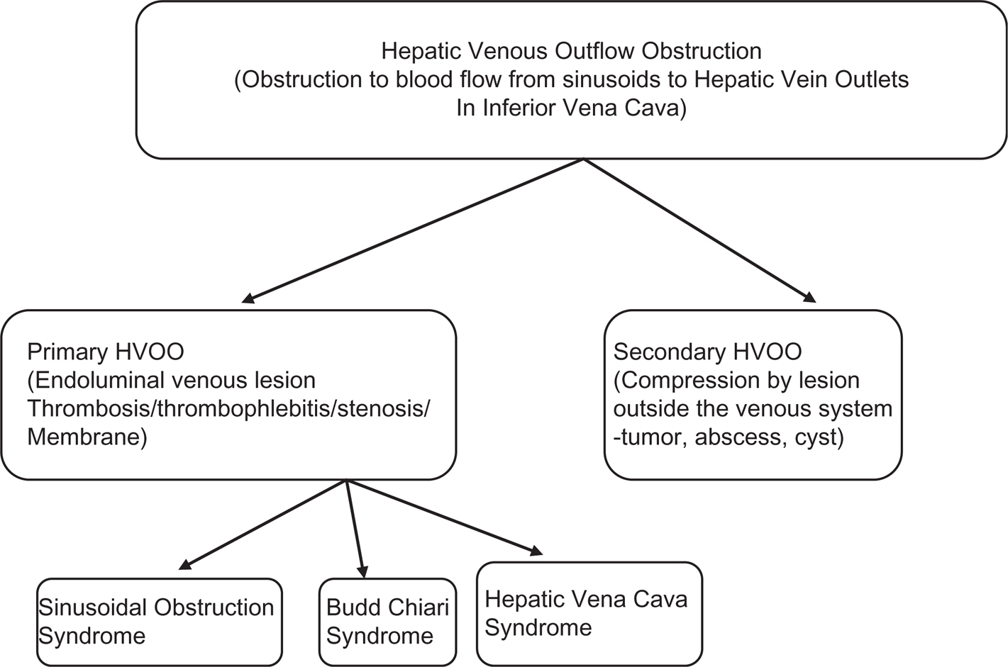 HVOO is classified into primary and secondary. Three primary diseases of HVOO are recognized: SOS, BCS, and HVCS. Almost all cases of HVOO seen in clinical practice belong to these three primary diseases. Among these, SOS and BCS are rare and seen exclusively in a particular subset of population: SOS in patients on myeloablative therapy and BCS in young women with hypercoagulable state. HVCS is endemic in developing countries where it is a common cause of ascites and LC.