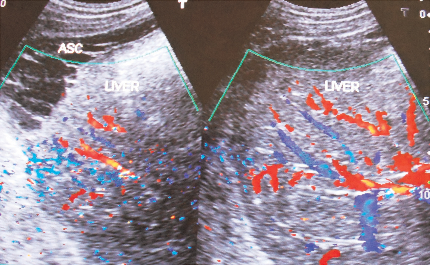 Figure 5. Ultrasonography and color Doppler of a patient with HVCS showing ascites with evidence of chronic peritonitis—Multiple intraperitoneal adhesions. Note the thrombosed, medium-sized branches of portal veins. ASC, ascites. (Copyright: Santosh Man Shrestha).