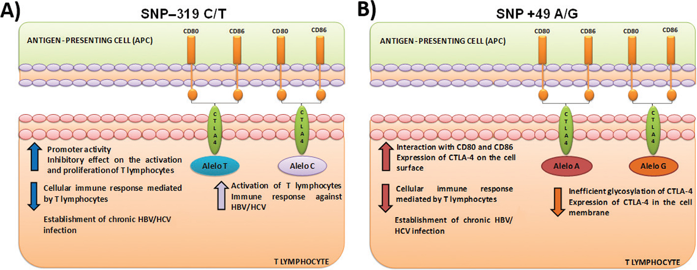 In relation to the previously mentioned observations, it has been reported that +49 A/G polymorphism plays an important role in the expression of the CTLA-4 gene. Individuals with the +49 A/A genotype have increased expression of CTLA-4 on the cell surface compared with the genotypes +49 A/G and +49 G/G (52). In addition, the presence of the +49A allele in T-cells increases the interaction with the B7.1 ligand and increases the inhibitory function of CTLA-4. Therefore, the +49G allele may favor the activation and proliferation of T-lymphocytes at a high rate. This implies that the +49G allele can favor viral elimination. In contrast, T-cells carrying the +49 A/A genotype have significantly lower rates of activation compared to T-cells with the +49 G/G genotype (53). These findings illustrate that molecular changes in CTLA-4 can modify the ability to control the proliferation of T-lymphocytes, promoting the persistence or elimination of HBV/HCV infection.