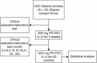 Figure 1. Study flowchart. Eighteen CKD patients were enrolled, 14 patients completed the 60-month treatment with prolonged-release Pirfenidone.