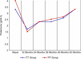 Figure 2. ITT and PP analysis for proteinuria levels.