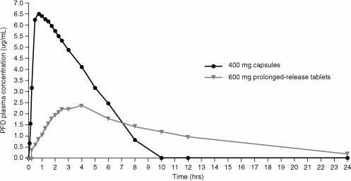 The standard-released PFD actually marketed as 257 mg capsules has been shown to cause intense gastrointestinal side effects in several clinical trials, resulting in a high dropout rate of patients (up to 42%) in different clinical trials, probably due to its high peak of fast absorption. Prolonged-released tablets (600 mg) were specifically designed to circumvent the high peak, maintaining total daily pharmaceutically stable levels. Figure 3 shows a dissimilar pharmacokinetics for the standard and prolonged-release formulations.