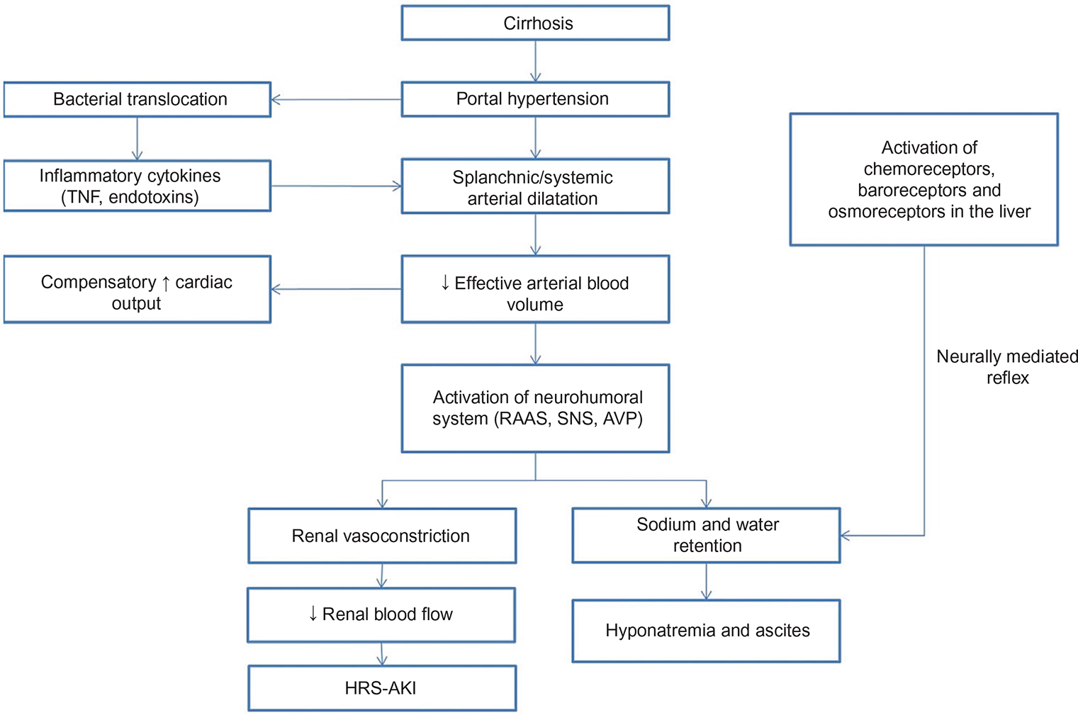 In order to maintain arterial pressure, systemic vasoconstrictor systems, such as the renin-angiotensin-aldosterone system (RAAS), the sympathetic nervous system (SNS) and the non-osmotic hypersecretion of arginine vasopressin (AVP), are activated leading to increased plasma renin activity and increased plasma norepinephrine levels. However, the activation of neurohumoral systems has harmful impacts on kidneys. Development of renal sodium and solute-free water retention leads to ascites and oedema, and hypervolemic hyponatremia, respectively. This results in significant renal vasoconstriction, which leads to a decrease in glomerular filtration rate and subsequently HRS (5).