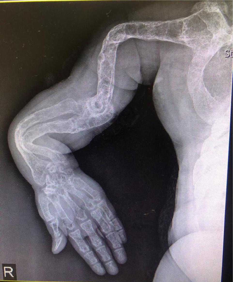 Figure 2: X-ray reveals severe bowing of the upper and lower limbs and marked generalized osteopenia.