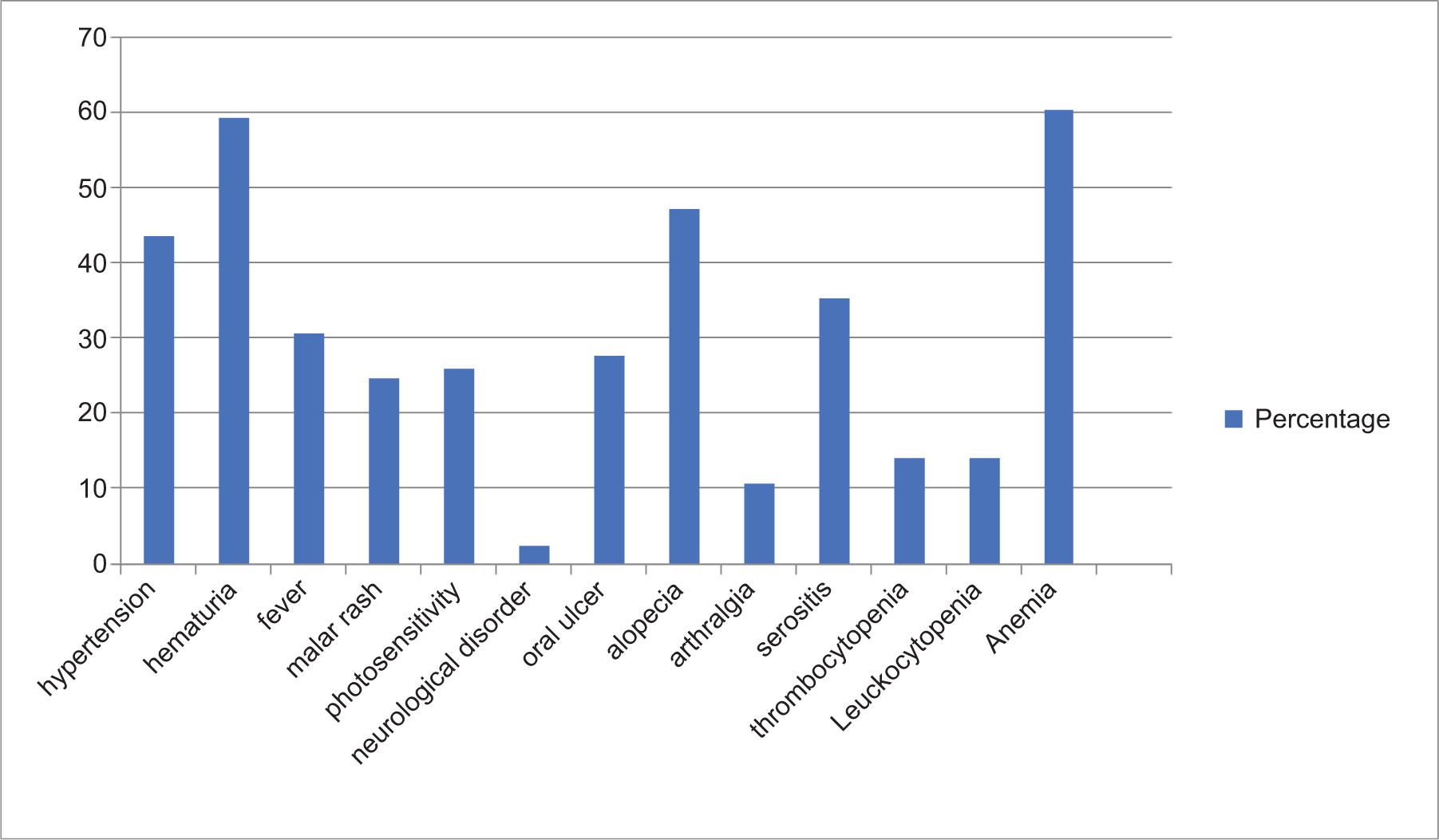 Hypertension was found in 148 (43.5%) patients, and their mean systolic and diastolic blood pressures were 139.38 ± 15.86 mm Hg and 83.6 ± 8.24 mm Hg, respectively. The most common clinical symptom at the time of presentation was arthralgia seen in 47.1% (n = 160) of the patients. Anemia was the most common presenting sign, seen in 60.3% (n = 205) of the patients. Regarding other clinical presentations, fever was present in 30.6% (n = 104) patients, malar rash in 24.7% (n = 84) patients, photosensitivity in 25.9% (n = 88) patients, oral ulcer in 24.7% (n = 84) patients, alopecia in 18.8% (n = 64) patients, serositis in 10.6% (n = 36) patients, thrombocytopenia in 14.1% (n = 48) patients, and leukocytopenia in 14.1% (n = 48) patients. Neurological disorder (2.4%) was the least common clinical presentation in LN patients (Table 1 and Figure 2).