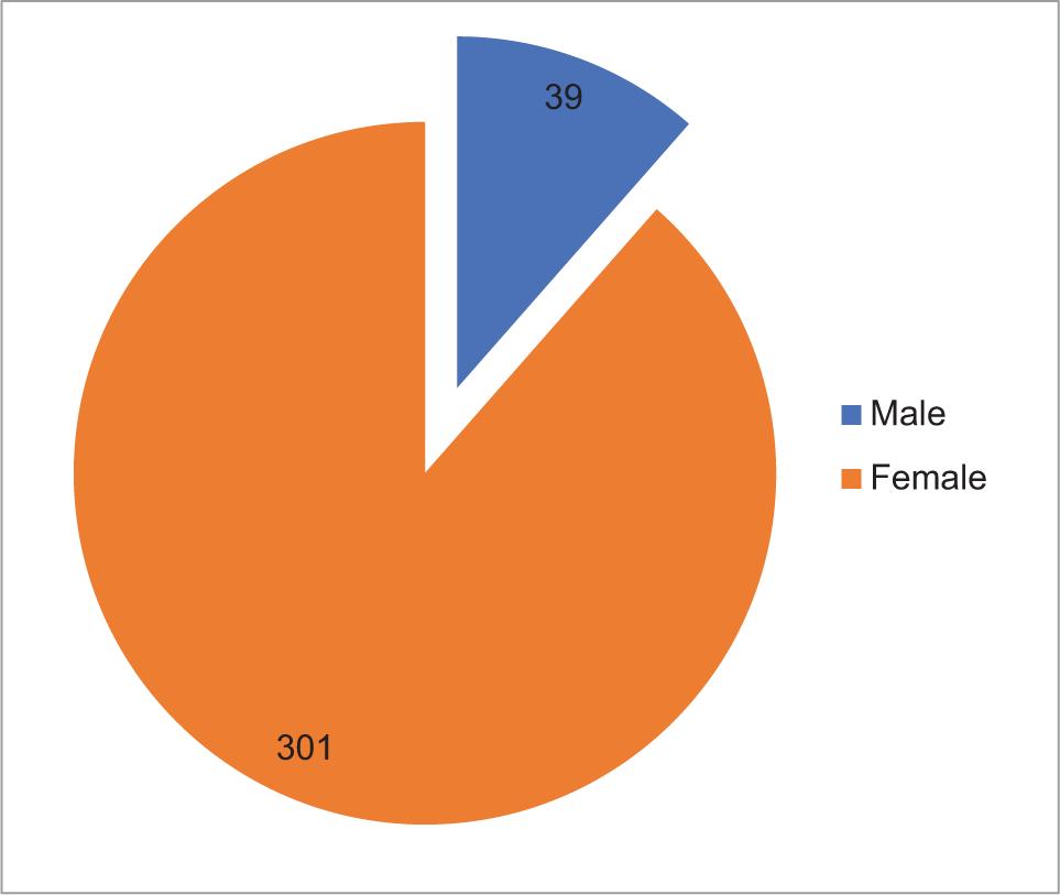 | Gender (M/F) = 39/301 (1:7.72) | ||