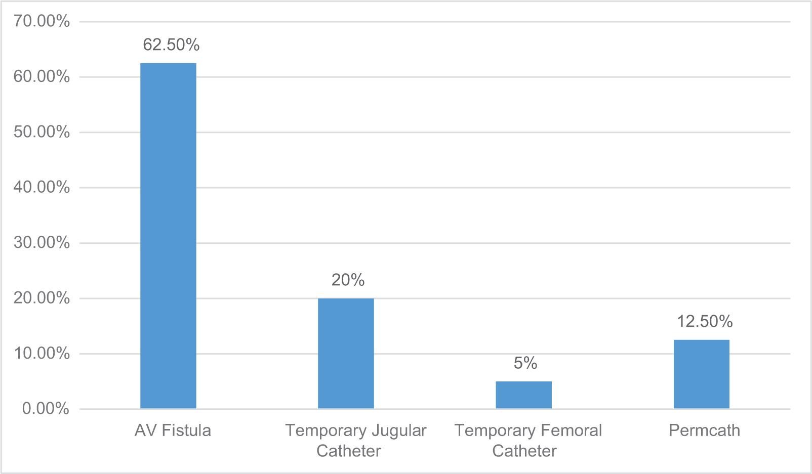Among the patients with PH, 25 patients (62.5%) had AV fistula, 10 patients (25%) had temporary dialysis catheters—eight patients (20%) jugular and two patients (5%) femoral, and five patients (12.5%) had tunneled jugular catheters as shown in Figure 2.