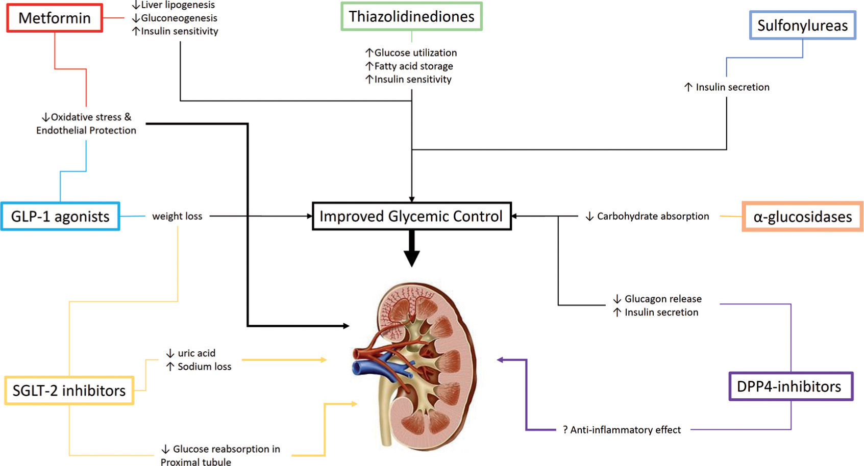 Like all diabetic complications, hyperglycemia is the major contributing factor to vascular injury and renal disease. Therefore, antihyperglycemic agents are expected to exhibit their renal protective properties by controlling glucose levels. However, there is variability in incidence of renal complications with different antihyperglycemic agents despite comparable glycemic control. This observation led to interest in the inherent renal protective role of these agents that is independent of their antihyperglycemic effect (Figure 1). Our current understanding of these mechanisms is discussed in detail in the following sections.