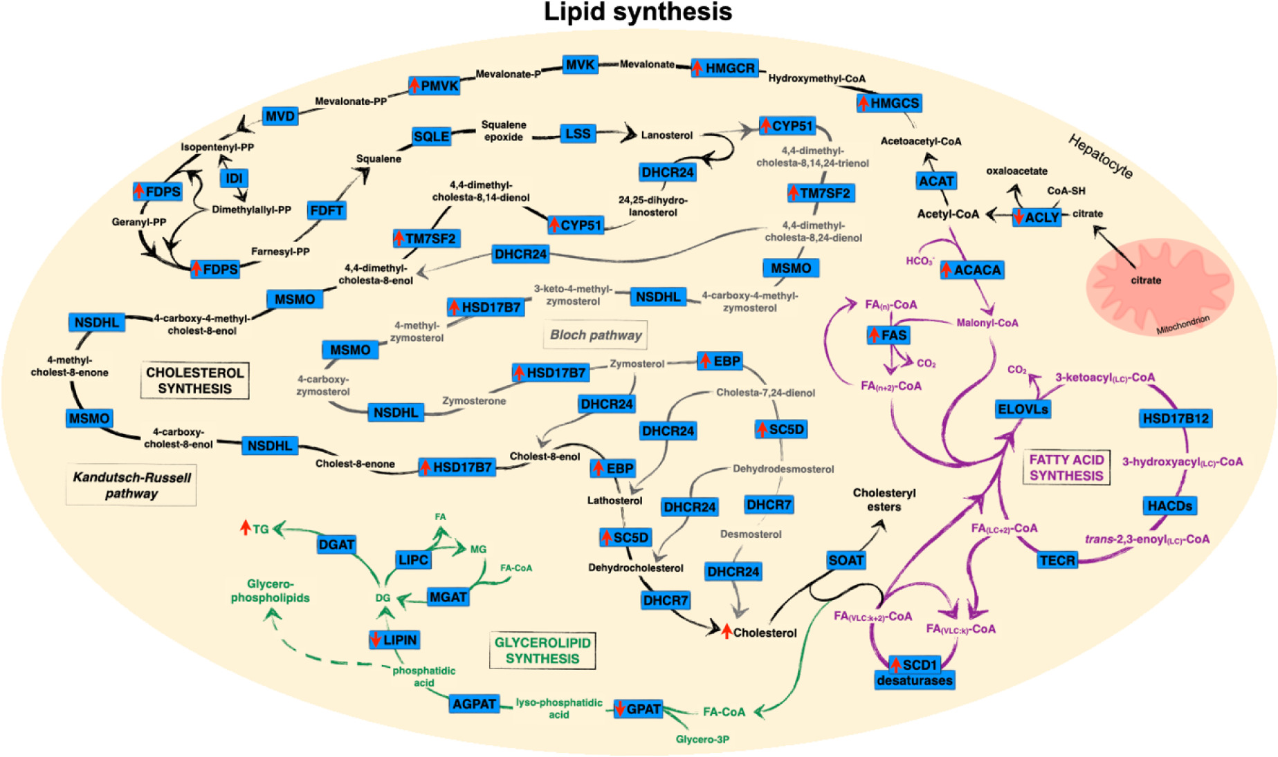 Figure 1 Association between hepatic iron accumulation and dysregulated lipid synthesis. Red arrows indicate direction of iron-associated regulation of gene, protein or metabolite expression as discussed in the text. The Bloch pathway of cholesterol synthesis is shown in black, with the branch to the Kandutsch–Russell pathway and its interconversions with the Bloch pathway shown in grey. Fatty acid synthesis, elongation and desaturation are shown in purple and glycerolipid synthesis is shown in green. In order to simplify the diagram, only some carbon numbers are shown and FA-CoAs destined for incorporation into glycerolipids are shown as being sourced from the pool of very long-chain FAs but may be sourced from any pool of cytosolic FA-CoA. FA(n): fatty acid containing n carbons; FA(LC:k): long-chain (or very long-chain [VLC]) fatty acid containing k double bonds. ATGL, adipose triglyceride lipase; DHCR24, dehydrocholesterol reductase; HACD, hydroxyacyl-CoA dehydratase; LIPC, hepatic lipase; LSS, lanosterol synthase; MGAT, monoglyceride acyltransferase; MSMO, methylsterol monooxygenase; MVD, mevalonate diphosphate decarboxylase; MVK, mevalonate kinase; NSDHL, NAD(P)-dependent steroid dehydrogenase-like; SOAT, sterol O-acyltransferase; SQLE, squalene epoxidase; TECR, trans-2,3-enoyl-CoA reductase. Other abbreviations are defined in the text. Pathways are based on data from KEGG (181) and Mazein et al. (182).