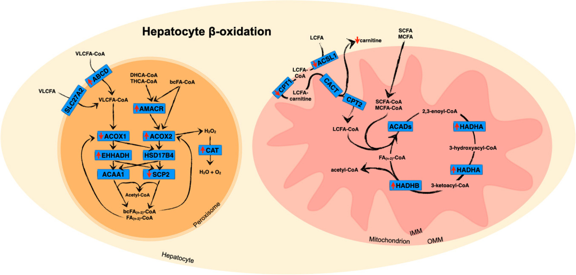 While the majority of fatty acid β-oxidation is undertaken by the mitochondria, β-oxidation of very long-chain and branched chain fatty acids is dependent on peroxisomes (138). Fatty acids are imported across the peroxisomal membrane via members of the adrenoleukodystrophy (ALD) subfamily of the ATP-binding cassette (ABC) transporters (139, 140). The solute carrier, SLC27A2, is also associated with peroxisomal import (Figure 2) (141, 142). Analogous to mitochondrial β-oxidation, each cycle of peroxisomal β-oxidation requires four enzymatic steps of oxidation, hydration, dehydrogenation and thiolytic cleavage (143). The first reaction in rats and mice is catalysed by one of three isoforms of acyl-CoA oxidase (ACOX) (144). Palmitoyl-CoA oxidase (ACOX1) is specific for saturated and monounsaturated substrates, including very long-chain fatty acids and dicarboxylic fatty acids. ACOX2 specifically reacts with CoA esters of the bile acid intermediates 3α,7α-dihydroxycholestanoic acid (DHCA) and 3α,7α,12α-trihydroxycholestanoic acid (THCA) and branched chain fatty acids, and ACOX3 is active with branched chain fatty acids. The peroxisomal L-bifunctional enzyme (enoyl-CoA hydratase and hydroxyacyl-CoA dehydrogenase [EHHADH] or LBP) and D-bifunctional enzyme (hydroxysteroid-17-beta dehydrogenase [HSD17B4] or DBP) catalyse the second and third steps of peroxisomal β-oxidation. Both have enoyl-CoA hydratase and 3-hydroxyacyl-CoA dehydrogenase activities but with opposite chiral specificity (145). In rodents, the final step is completed by one of three different thiolases—3-ketoacyl-CoA thiolase A or B (Acaa1a or Acaa1b) or sterol carrier protein 2 (Scp2) (143).