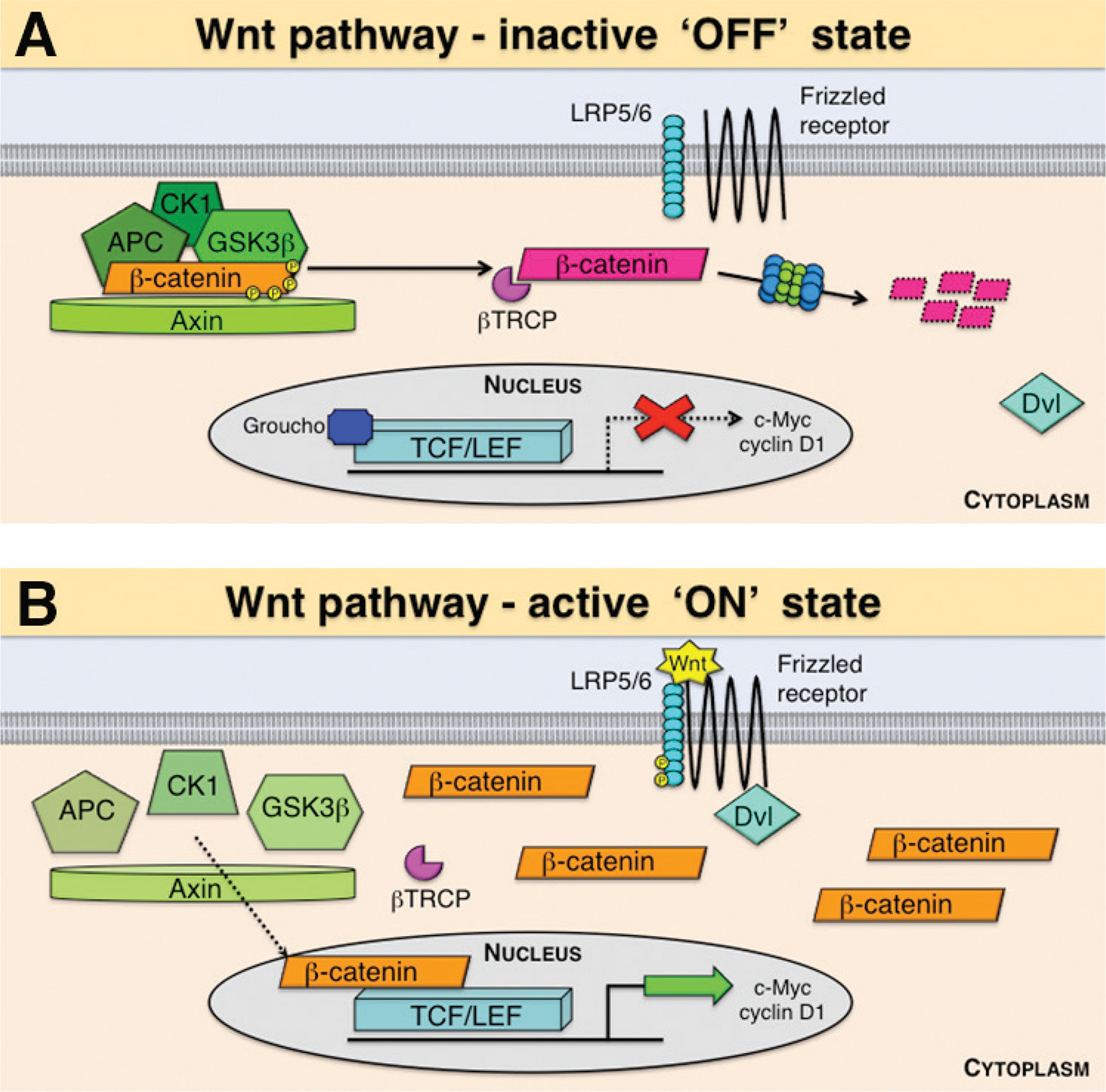 Figure 2 The canonical Wnt/β-catenin pathway. In the absence of a Wnt signal (‘OFF’ state), the destruction complex, consisting of adenomatosis polyposis coli (APC), glycogen synthase kinase 3-β (GSK3β), casein kinase 1 (CK1) and Axin, binds and phosphorylates β-catenin, marking it for ubiquitination by the E3 ubiquitin ligase subunit beta-transducin repeat containing protein (βTRCP) and degradation through the proteasome. In this case, the repressor Groucho remains bound to T-cell factor/lymphoid enhancer factor (TCF/LEF) transcription factors, inhibiting transcription of target genes such as c-Myc and cyclin D1 (A). When a Wnt protein binds a Frizzled receptor and the low-density lipoprotein receptor-related proteins 5 and 6 (LRP5/6) in the ‘ON’ state, the protein dishevelled (Dvl) activates a cascade, which eventually disrupts the destruction complex, leading to stabilisation, cytoplasmic accumulation and nuclear translocation of β-catenin and ultimately the transcription of target genes (B).