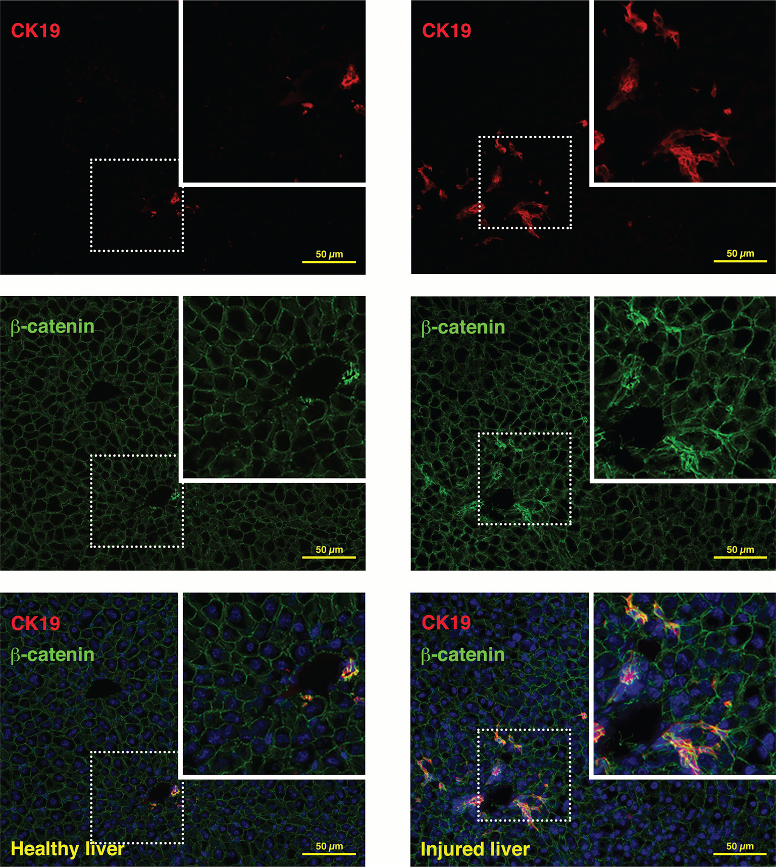 Figure 3 Beta-catenin and CK19 expression in healthy and injured liver. In healthy mouse liver, only ducts stain with an antibody targeting CK19 and show cytoplasmic and nuclear β-catenin expression, while β-catenin is exclusively membrane-bound in periportal hepatocytes (healthy liver, left panel). In injured liver (2-week treatment with a choline-deficient, ethionine-supplemented diet15), the CK19+ compartment expands and demonstrates strong cytoplasmic and nuclear β-catenin, signifying active signalling (injured liver, right panel).