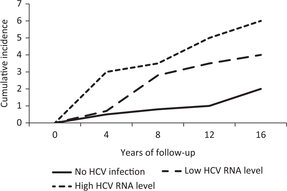 HCV infection is frequently associated with CKD stages 4 and 5. Blood transfusions and nosocomial transmission in dialysis patients are the causes of the higher prevalence of HCV infection in these patients when compared with the general population. In patients on dialysis, the nosocomial transmission also seems to occur independently of blood transfusions (15–17). In one study, of the 1423 hemodialysis patients who never received previous blood transfusions, 18% had hepatitis C antibodies (15). In addition to a higher frequency, epidemiological studies have demonstrated that HCV infection is an independent risk factor not only for the development of CKD, but also for the rapid progression of CKD (ERCHIVES study) (18). Another study (19) confirmed that HCV-positive patients have a 40% higher chance of developing renal failure compared to HCV-negative patients. These findings were further confirmed by a systematic review and meta-analysis (20). In addition to being a risk factor for renal failure, HCV infection is also a risk factor for mortality in patients with end-stage renal disease (ESRD). A meta-analysis of 14 observational studies confirmed that HCV-Ab-positive serological status is an independent and significant risk factor for death in patients on dialysis (21). Similarly, a prospective observational study of 16,720 hemodialysis patients found that HCV positivity is associated with an increased risk of mortality (RR 1.17) (22). The Risk Evaluation of Viral Load Elevation and Associated Liver Disease/Cancer (REVEAL) HCV study is a large prospective community-based cohort study in Taiwan that provides an excellent opportunity to investigate the natural history of HCV infection and associated diseases (23). Recently, a study by Lai et al. (24) demonstrated that chronic HCV infection is an independent risk factor for the development of ESRD in patients with genotype 1. Patients with low and high HCV-RNA levels had, respectively, 2.6- and 4.3-fold increased risk of developing ESRD compared with patients who were not infected with HCV (Figure 1). In a further study, Lai et al. demonstrated that, in addition to viral load, genotype 2 is a strong predictor of CKD (25). The mechanism by which HCV infection increases the risk of morbidity and mortality in patients with CKD is not clear. About 50% of the deaths are related to cardiovascular diseases, and an association between malnutrition-inflammation syndrome (MIA syndrome) and poor outcomes has been suggested (26). Other studies have highlighted that HCV has an atherogenic role, which could aggravate metabolic syndrome (27).