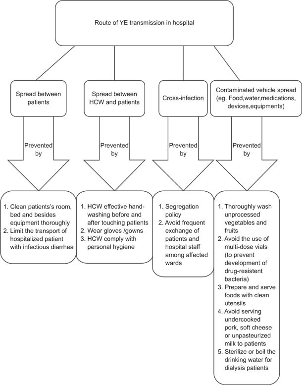 Several studies have suggested that HD patients are most susceptible to nosocomial infections among all other hospitalized patients (63–65). There are reports of YE spread in hospital dialysis units (21, 66–68), although nosocomial transmission of YE infection is not a major risk for HD patients (69–71). Nosocomial transmission modes of YE are typically through the fecal–oral route; they occur by contact spread between patients, patients and healthcare workers (HCWs) (either direct or indirect), or through contaminated water, food, medications, or devices and equipment (66–68). Although the clinical significance and the contribution of YE to nosocomial transmission in dialysis units are unclear, it is important to strictly enforce all recommendations in universal precautions and HD procedures to prevent YE along with other gastrointestinal infections among all patients in dialysis units. Furthermore, a segregation policy can be considered for HD patients with severe diarrhea to prevent direct or indirect contact transmission (66, 72). Figure 1 summarizes the nosocomial transmission routes and the prevention of YE infection in dialysis units (73–76).