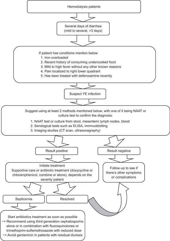 Figure 2: Suggested algorithm for the management of Yersinia enterocolitica infection in hemodialysis patients. YE: Yersinia enterocolitica; NAAT: nucleic acid amplification test; CT: computed tomography; ELISA: enzyme-linked immunosorbent assay.
