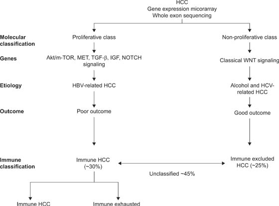 Researchers all over the world have done extensive genomic, epigenomic, and transcriptomic profiling of resected tumors to understand the tumor biology. Based on these findings, a molecular classification of HCC has been proposed which has clinical and prognostic implications as well as it may guide in the selection of therapeutic modality. Two classes proliferative and non-proliferative have been suggested. The proliferative class has chromosomal instability with more prevalence of TP53 inactivation, cyclin D1 (CCND1), and fibroblast growth factor 19 (FGF19) amplifications leading to activation of RAS–MAPK (mitogen activated protein kinase), phosphatidylinositol-3-kinase (PI3K)/Akt and the mammalian target of rapamycin (mTOR) and tyrosine-protein kinase Met signaing pathways affecting cell proliferation and survival. Two subclasses S1 and S2 based on their pathways and gene activation have been proposed. HBV-related HCC belongs to the proliferative class with poor outcomes (Figure 1).
