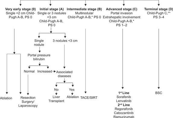 Among all the treatment modalities available, surgical options like hepatic resection and liver transplantation are the best. Hepatic resection has evolved dramatically over time due to a laparoscopic/minimally invasive approach. In BCLC staging, there was a mono-parametric approach to the selection of patients with single tumors, Child A cirrhosis, early portal hypertension with hepatic vein portal system gradient (HVPG) ≤10 mmHg or bilirubin ≤17 µMol/L for hepatic resection. However, a multi-parametric approach based upon Child A cirrhosis with model for end stage liver disease (MELD)<10 with an acceptable grade of portal hypertension, acceptable remaining liver parenchyma after resection to achieve adequate hepatic function, and adopting a laparoscopic/minimally invasive approach for surgical treatment of HCC has come into practice (32). This allows to include patients who were previously denied liver resection. Post hepatic liver failure (PHLF) is the most important complication of hepatic resection. Prodeau et al. (33) have recently proposed an ordinal model based upon pre-operative variables such as liver remnant volume ratio, platelet count, and intent-to-treat laparoscopy with intraoperative variables like intra-operative blood loss and per protocol, laparoscopy to predict symptomatic PHLF in cirrhosis with HCC patients. Overall resection provides 60% survival with an HCC recurrence rate of ∼70% at 5 years (34).
