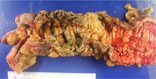 Figure 1: Gross image of the right colon with a single, deep, cratered, perforated ulcer (3.2 × 2.6 × 0.4 cm) with multiple additional smaller ulcers in the ascending colon (ranging from 0.3 to 1.3 cm).