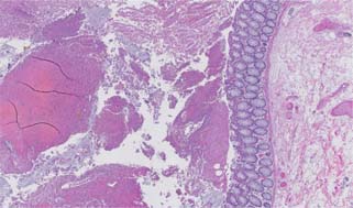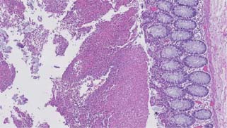 Figure 2: Low power image of colonic mucosa with fibrinopurulent exudate and crystals (Hematoxylin and eosin, 2× magnification).