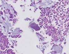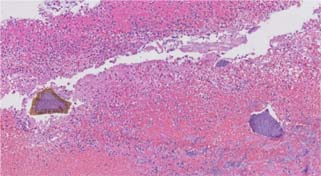 Figure 4: Medium power image of fibrinopurulent exudate and Kayexalate crystal (Hematoxylin and eosin, 10× magnification).