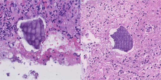 Figure 5: Medium power image of fibrinopurulent exudate, with sevelamer (left) and Kayexalate (right) crystals (Hematoxylin and eosin, 10× magnification).