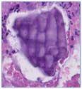 Figure 6: High power images of fibrinopurulent exudate and embedded Kayexalate crystals with purple color and typical fish-scale pattern (Hematoxylin and eosin, 20× magnification).